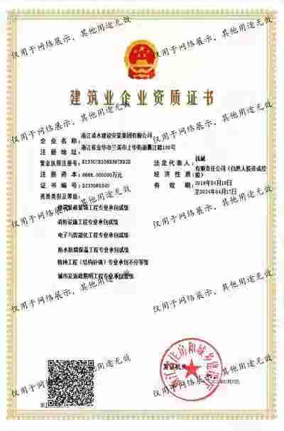 浙江清水建設(shè)安裝集團(tuán)有限公司成立于2013年,注冊資金6688萬元。集團(tuán)具有消防設(shè)施工程專業(yè)承包壹級、城市與道路照明專業(yè)承包壹級、電子與智能化專業(yè)承包壹級、建筑裝飾裝修專業(yè)承包貳級、防水防腐保溫專業(yè)承包貳級、市政工程施工總承包貳級、機(jī)電工程施工總承包貳級、建筑工程施工總承包貳級、電力工程施工總承包貳級、機(jī)電工程專業(yè)承包貳級、環(huán)保工程專業(yè)承包貳級、古建筑工程專業(yè)承包貳級、特種工程結(jié)構(gòu)補強專業(yè)承包、建筑施工勞務(wù)作業(yè)專業(yè)承包(憑建筑業(yè)企業(yè)資質(zhì)證書經(jīng)營